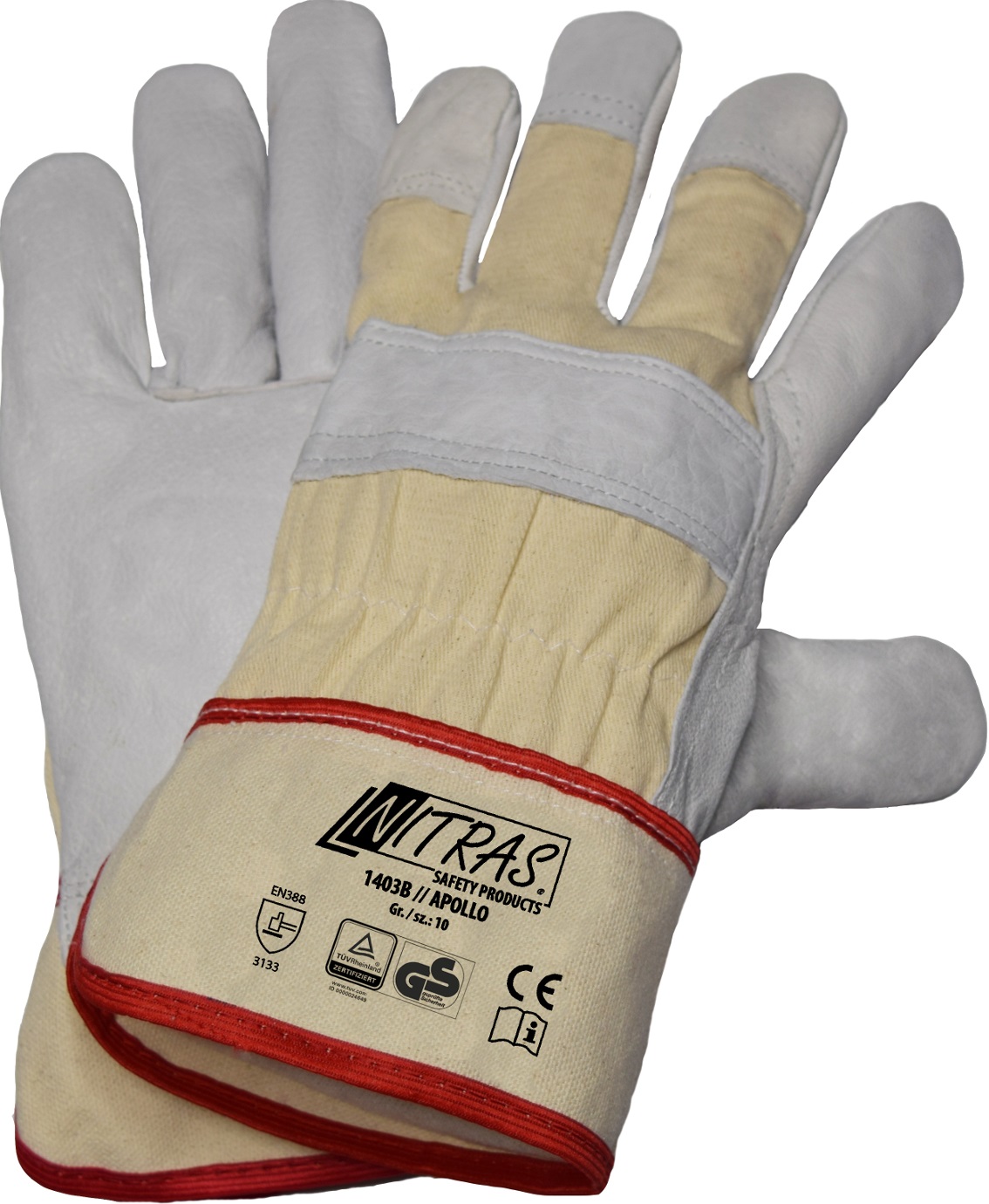 NITRAS APOLLO, cowhide leather gloves, cotton back, natural color, cowhide leather, grey, palm lining, canvas cuff, double seams, leather selection B