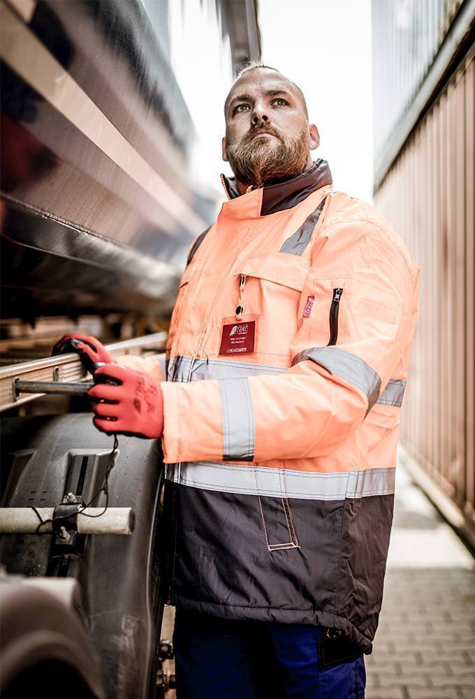 NITRAS MOTION TEX VIZ, warning protection parka, neonorange / blue, detachable, unlined hood, two breast and side pockets each, smartphone pocket inside and outside, sleeve pocket, Napoleon pocket, tablet pocket, inside pocket, circumferential reflective strips, 2-way zipper, detachable winter hood optionally available, breast pocket with inside loop for identification sleeves