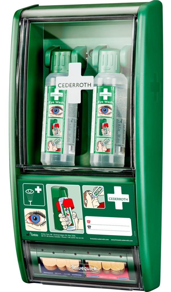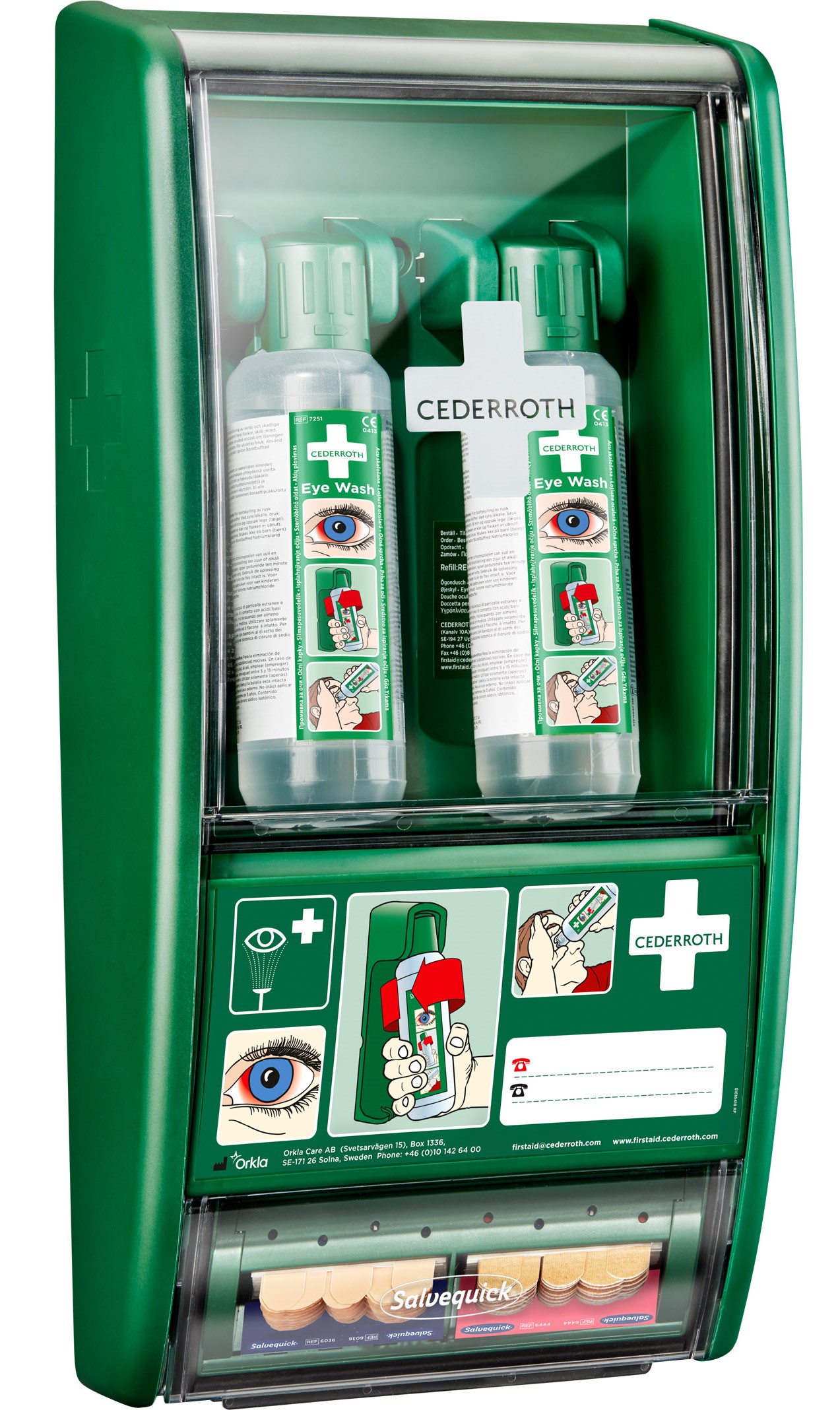 Cederroth Eye Wash - proven to be more effective than saline for alkali and acid splashes. The eye wash station is designed for quick relief. The station holds 2 bottles that open when removed from the wall mount. The bottles are designed to flush the eye for approximately one and a half minutes with a continuous strong flushing stream. The products have a shelf life of 4.5 years. Buffered solution with a higher chance of saving the eye. Our eye rinse solution balances the pH in the eye, which means it neutralizes alkaline and acid splashes. In doing so, it works faster than conventional saline solution. The effect is generally stronger with alkalis than with acids. With the Salvequick plaster dispenser the plasters are always at hand and ready for use. In our Salvequick plaster dispenser the plasters are pulled out downwards. The refill inserts are locked in place. This prevents wastage. With space for products of your own choice, the contents can be adapted to the specific needs of e
