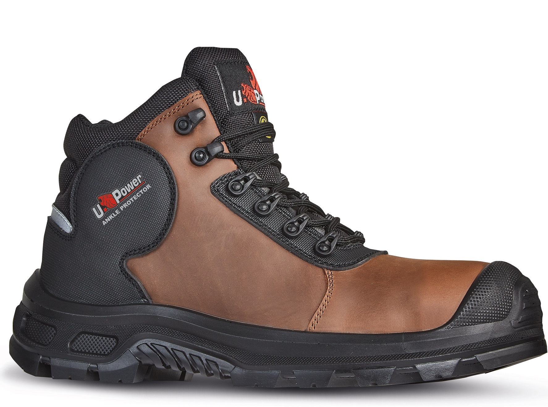 Hochsicherheitsschuhe U-Power Red Industry Linie, Obermaterial aus Weiches Pull-Up Leder mit abriebfesten Aufsätzen und Knöchelschutz, wasserabweisend, Composite-Schutzkappe, Durchtrittsicherheit, und PU/PU, abriebfest, antistatisch, Öl-resistent und rutschhemmend. Fußbett WOW2 mit Anti-Ermüdungs Einsatz. S3 AN CI SRC ESD