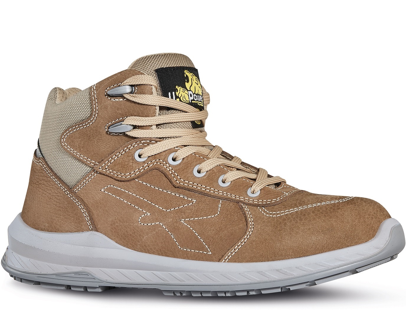 Hohe Arbeitsschuhe, leicht und bequem, U-Power Red Industry Linie, Obermaterial aus Weiches gemilltes Nubukleder, wasserabweisend, Composite-Schutzkappe, Durchtrittsicherheit, und PU/PU, abriebfest, antistatisch, Öl-resistent und rutschhemmend. Fußbett WOW2 mit Anti-Ermüdungs Einsatz. S3 CI SRC ESD