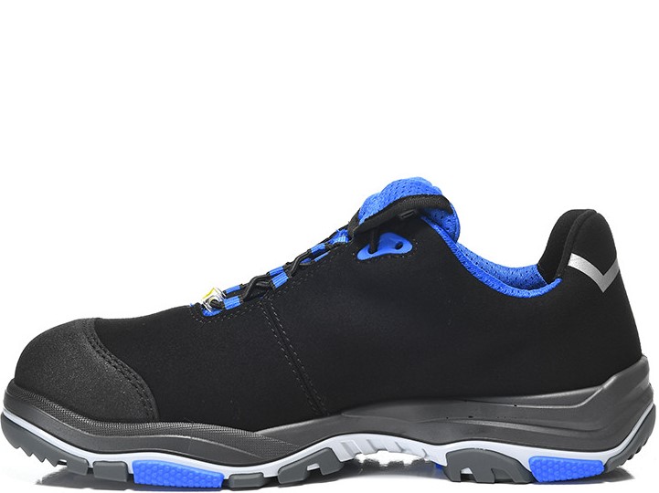 Der sportlich schwarz-blaue Sicherheitshalbschuh ist aus hydrophobierter Mikrofaser gefertigt und im Inneren besonders atmungsaktiv durch ein Futter aus Textilmaterial. Der Tragekomfort wird noch weiter erhöht durch eine semi-orthopädische, ESD-fähige Einlegesohle sowie eine TPU/PU Sohle, die durch ihre besonders gute Stoßabsorption auffällt. Eingearbeitete Drehpunkte minimieren Reibungswiderstände in der Drehung. Der abriebfeste Spitzenschutz und eine eingearbeitete Stahlkappe vervollständigen die Ausstattung dieses SRC zertifizierten Schuhs.
