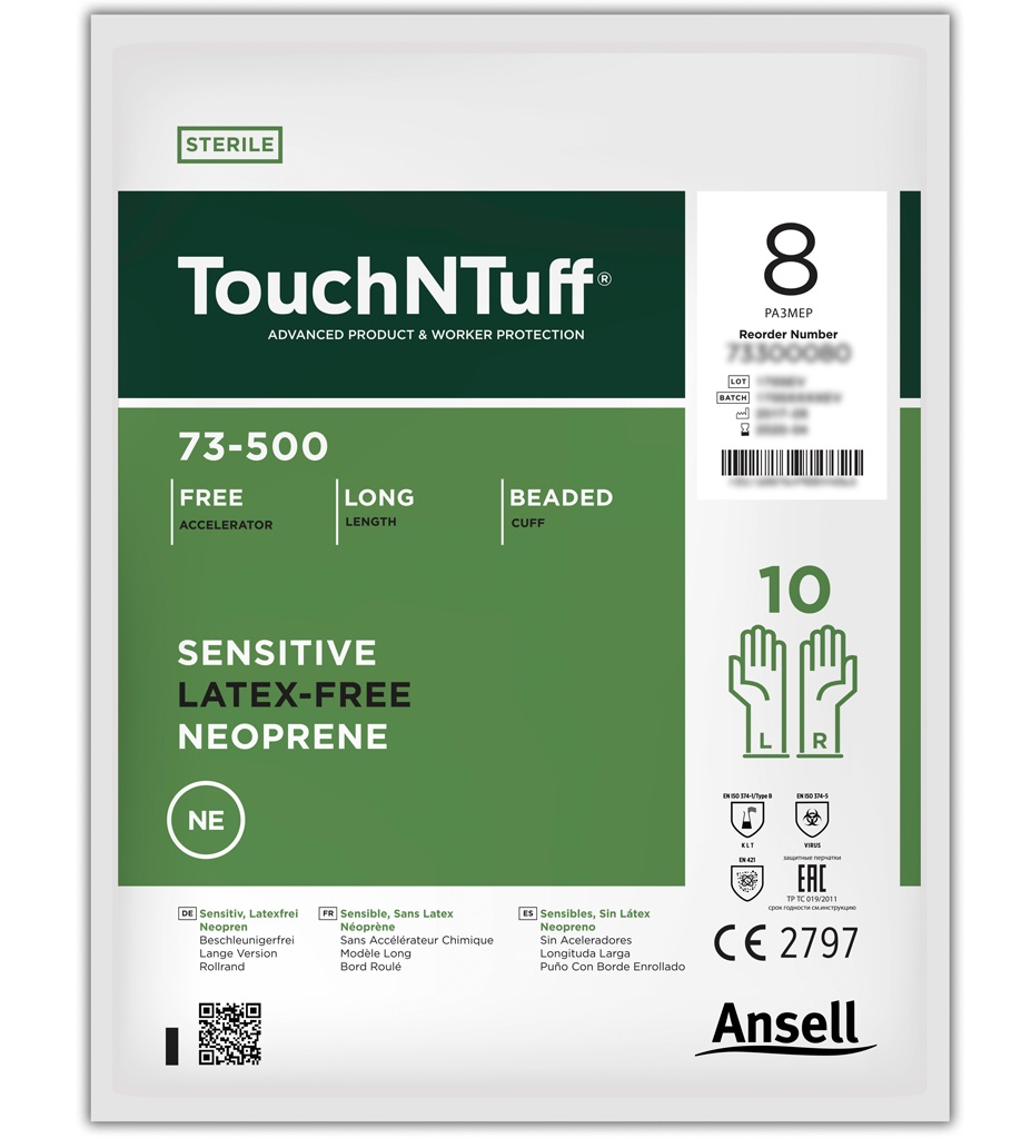 Die neue Formulierung bewirkt durch ihre Polymer-Wandstärke von nur 0,13 mm eine bisher unerreichte Tastsensibilität bei einer doppelten Behandschuhung. Die Herstellung mit ergonomischen, der Hand nachempfundenen Formen sorgt für exzellente Passform und hohen Tragekomfort. Die frühzeitige Ermüdung der Hände und weiterer Stress wird vermieden. Der aus reinem Polychloropren hergestellte Handschuh schützt vor Spritzern eines breiten Spektrums von Chemikalien. Da in der Produktion kein Naturkautschuklatex und keine Beschleuniger verwendet werden, besteht nur ein reduziertes Risiko von Typ-I- und Typ-IV-Allergien. Die SureFit-Technologie von Ansell verhindert für einen noch größeren Schutz ein Herunterrollen der Stulpe am Unterarm. Die Innenbeschichtung aus Polyurethan ermöglicht ein einfaches An-/Ausziehen mit trockenen oder nassen Händen. Die Konstruktion und Polymer-Wandstärke erleichtern und erhöhen den Komfort bei einer doppelten Behandschuhung. Die Kremfarbe macht Risse und Löcher beim Tragen in Verbindung mit Handschuhen einer anderen Farbe sichtbar. Erhältlich in zwei Ausführungen: TouchNTuff® 73-300 unsteril, und TouchNTuff® 73-500 steril.