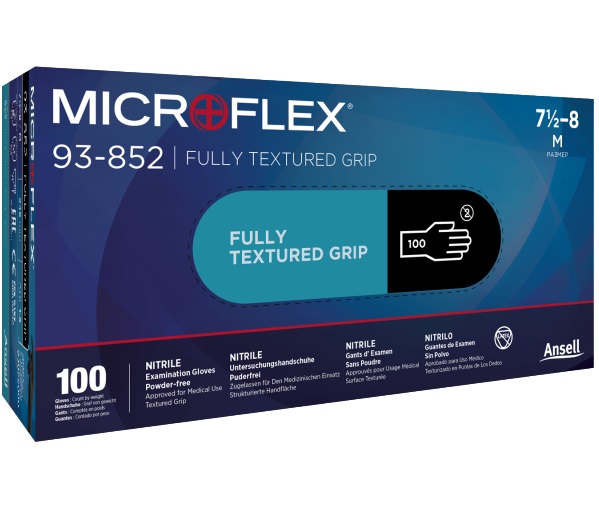 Die schwarze Farbe des Handschuhs verbirgt Flecken und bildet einen kontrastreichen Hintergrund für das Erkennen von Materialien einer helleren Farbe. Der Microflex 93-852 zeichnet sich im Vergleich zu den Standards der Normen ASTM D6319 und EN 455 durch eine höhere Zugfestigkeit aus. Die Hände können sich beim Tragen des Handschuhs komfortabel frei bewegen. Die vollständig texturierte Struktur ohne Schaumstoffdämpfung ermöglicht dem Handschuhträger einen festen Nassgriff bei der Handhabung von Objekten. Die Latex- und Puderfreiheit des Handschuhs bewahrt die Haut vor einer Typ-I-Allergie, Reizung oder Austrocknung.