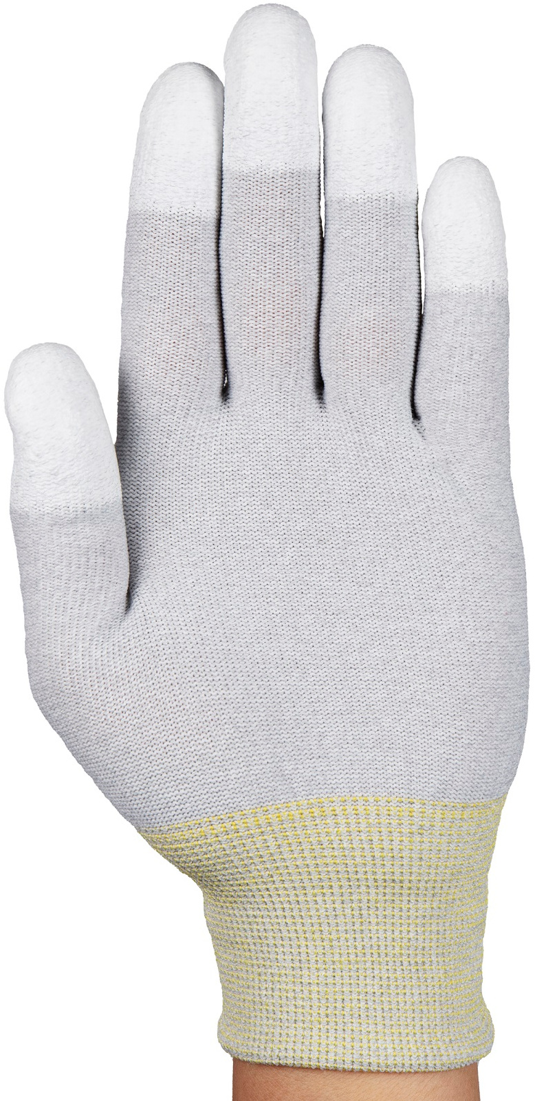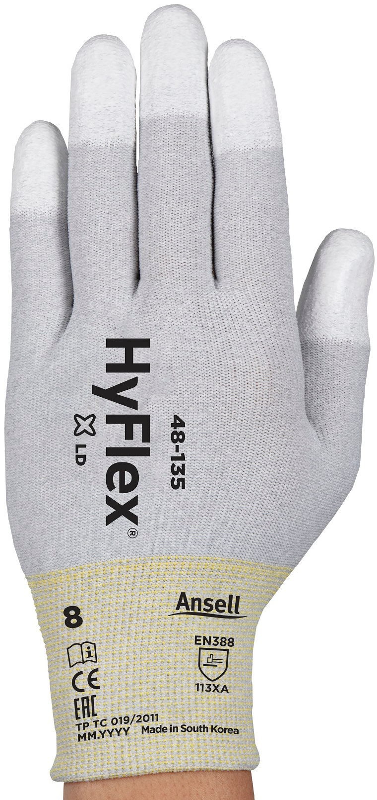 Die komfortablen HyFlex® 48-130 und 48-135 erfüllen zu einem vernünftigen Preis alle Anforderungen an den Schutz vor elektrostatischen Entladungen. Der flexible Nylonträger (15-Gauge) bietet eine gute Fingerbeweglichkeit. Die integrierte Kohlefaser ist die ergänzende Lösung für einen wirtschaftlichen Produktschutz. Die nahtlose Ausführung und umfangreiche Größenauswahl gewährleisten Tragekomfort und gute Passform. Durch die Polyurethan-Beschichtung der Innenhand bietet der HyFlex® 48-130 gute mechanische Belastbarkeit und Haltbarkeit. Beim HyFlex® 48-135 sind nur die Fingerspitzen beschichtet. Dadurch sind Passform und Flexibilität nochmals verbessert. Die Beschichtung der Fingerspitzen verhindert außerdem die Übertragung von Schweiß auf elektronische Bauteile.