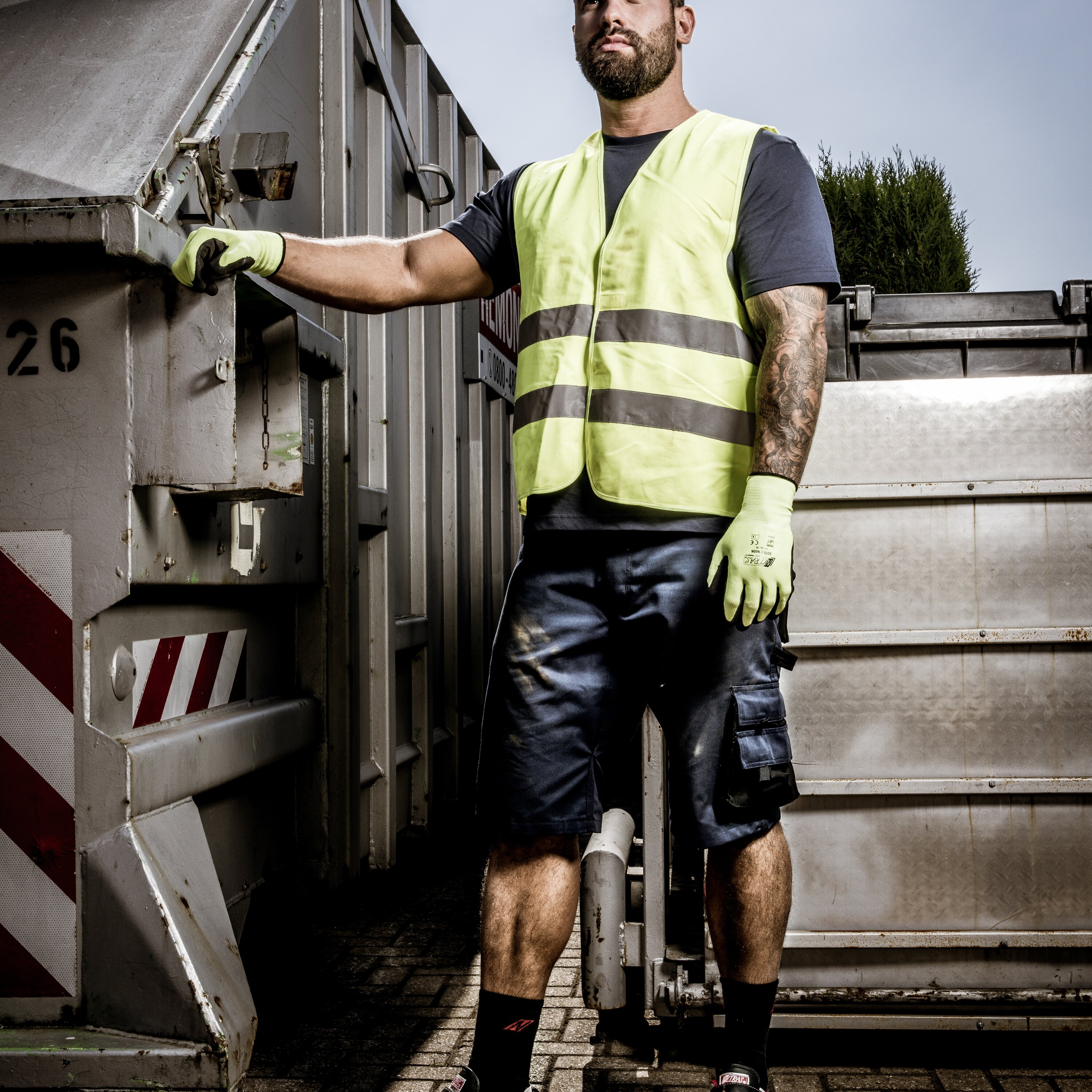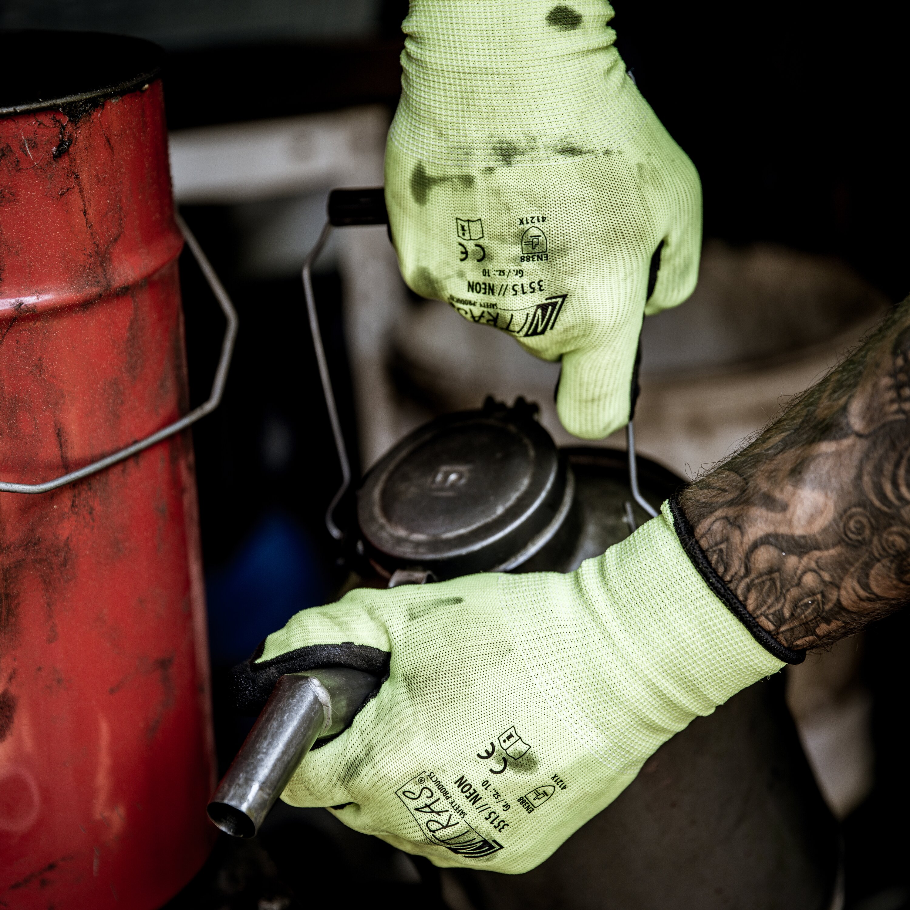 NITRAS NEON, Polyesterhandschuhe, neongelb, gesandete Nitril-Beschichtung, schwarz, teilbeschichtet auf Innenhand und Fingerkuppen, Strickbund