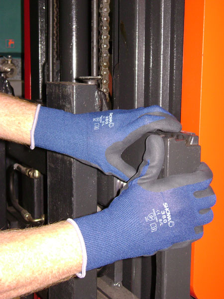 Der vielfältig einsetzbare Handschuh 380 gewährleistet ein präzises Tastgefühl und bietet eine dauerhafte Griffsicherheit sowohl in nassen als auch in trockenen Umgebungen beim Umgang mit kleinen öligen Komponenten oder beim Heben schwerer Gegenstände. Mit dem Fokus auf Komfort verhindert das elastische Bündchen das Eindringen von Schmutz in den Handschuh und über die offene Rückseite können Luft und Feuchtigkeit entweichen.