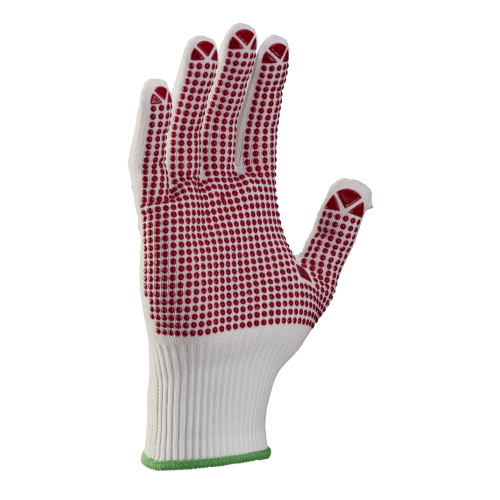 - weißer Nylon-Feinstrickhandschuh mit roten PVC Noppen