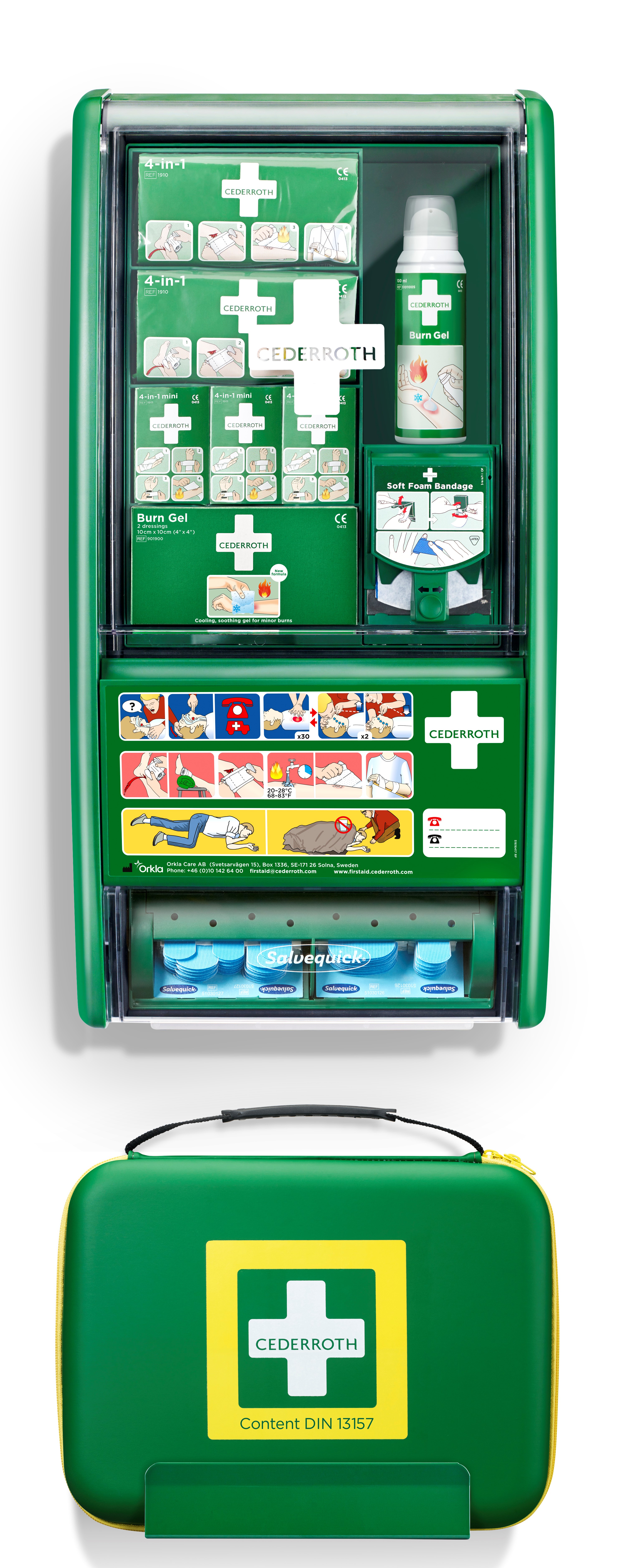 Die Cederroth First Aid & Burn Station wurde speziell auf die Versorgung von Verbrennungen und Schnittwunden ausgelegt. Mit den richtigen Produkten, die zudem schnell zur Hand sind, ist bei Unfällen wirksame Linderung möglich.