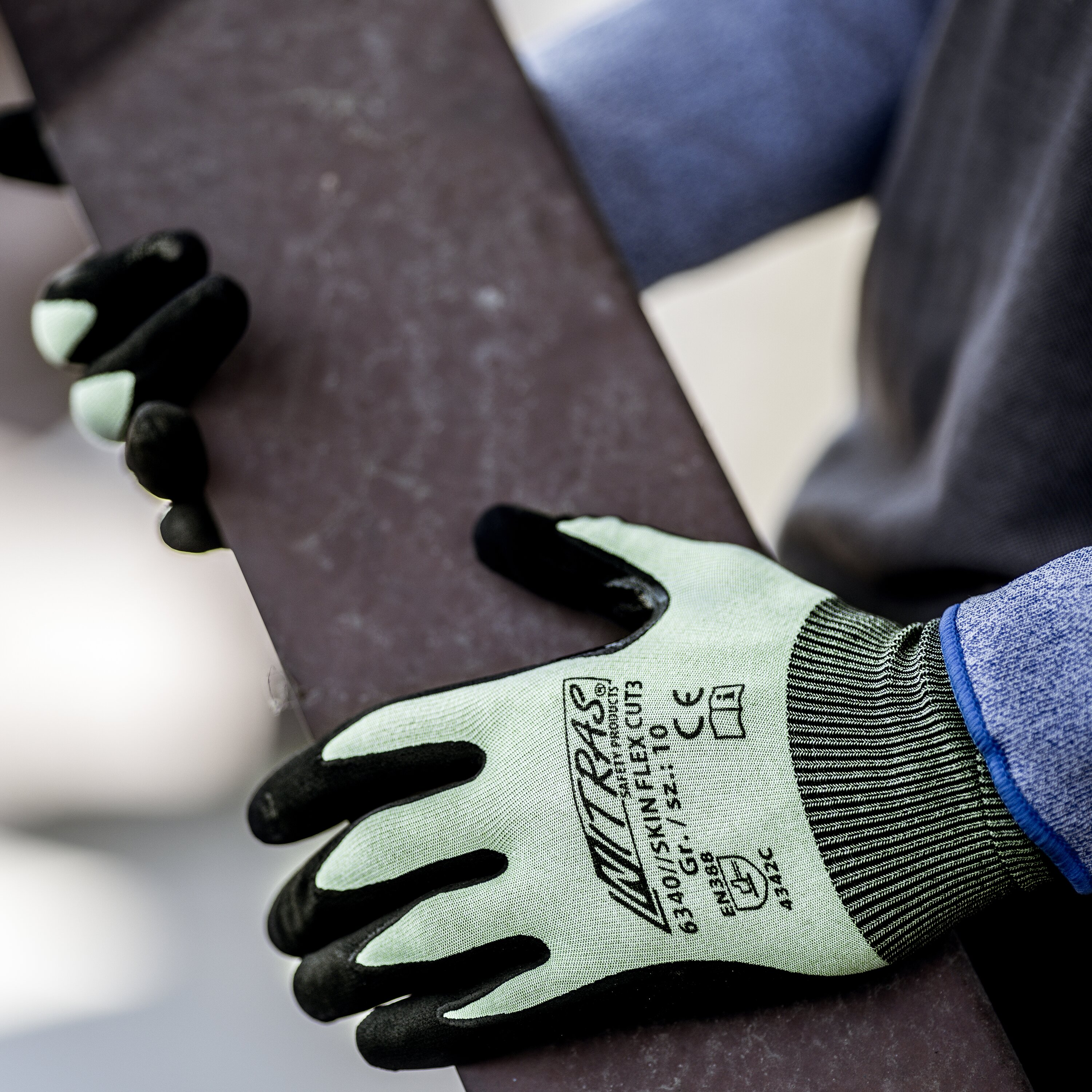 NITRAS SKIN FLEX CUT3, Schnittschutzhandschuhe, grün, Spezialbeschichtung, teilbeschichtet auf Innenhand und Fingerkuppen, schwarz, Strickbund, hoher Schnittschutz, höchster Tragekomfort, Spezialgarn, 18 Gauge, perfekte Passform, verstärkte Daumenbeuge.