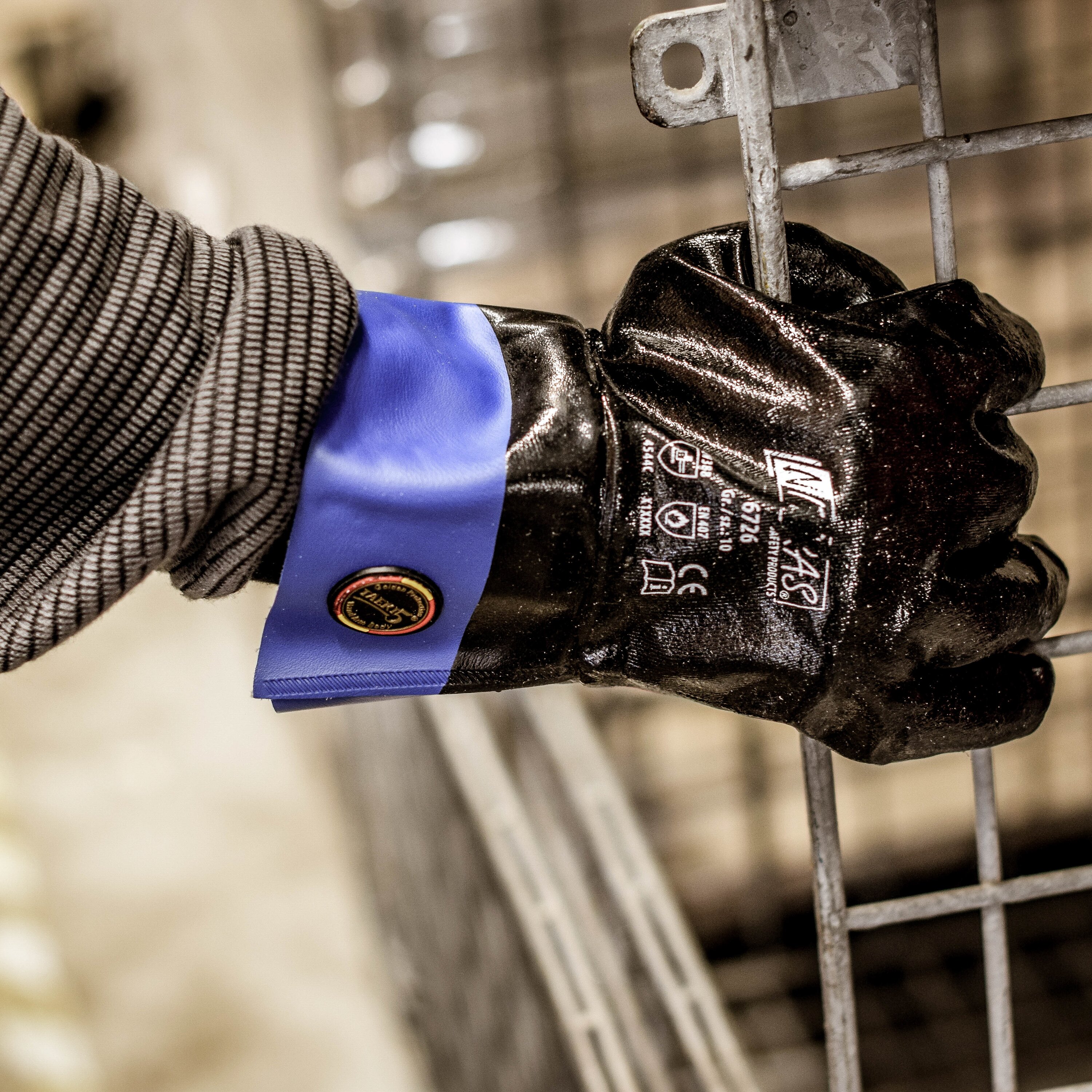 NITRAS TAEKI5 Schnittschutzhandschuhe, schwarz, zweilagiger Liner, Liner innen: TAEKI5-Spezialgarn, gesamter Innenbereich, grau, Liner außen: Baumwolle, naturfarben, Nitril-Beschichtung, vollbeschichtet, schwarz, blaue PVC-Stulpe, höchster Schnittschutz (Leistungsstufe 5), höchste Fingerfertigkeit, beide Liner sind miteinander vernäht, somit verbesserte Haltbarkeit und höchster Tragekomfort.